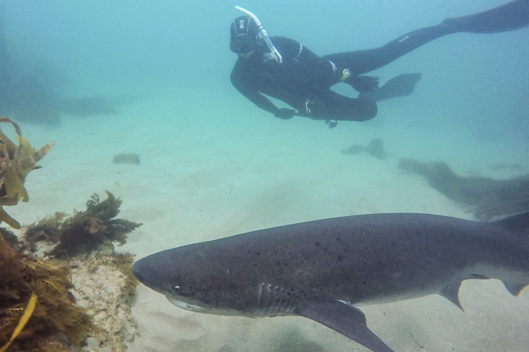 Possible rare appearances from blue, smooth-hound, angel & even thresher sharks. Other ocean life in the areas we explore includes rays, schools of fish, turtles, lobster, and crabs. Curious seals and sea lions love to play in these waters. Depending on the time of year dolphins, whales and even sunfish can make an appearance. We find sharks on about 90% of the snorkeling excursions; there are no guarantees.